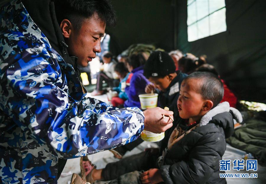 波羅鄉(xiāng)一名工作人員在臨時過渡安置點(diǎn)帳篷內(nèi)給一名兒童喂飯(10月14日攝)。 新華社記者 劉東君 攝