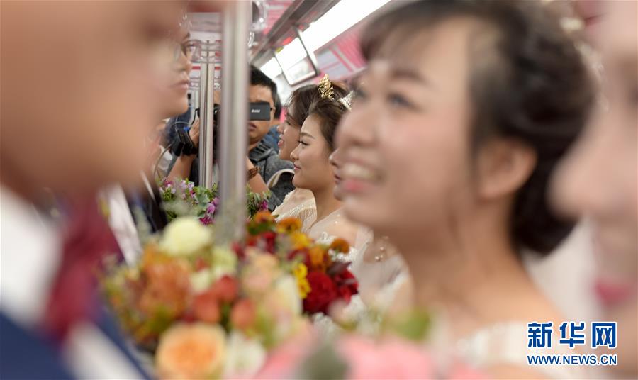 10月18日,在合肥市地鐵一號(hào)線車廂內(nèi),新人們互相許諾,期許愛情。 當(dāng)日,中鐵四局集團(tuán)城市軌道交通工程分公司的18對(duì)新人在安徽合肥地鐵一號(hào)線的車廂里舉行了一場(chǎng)集體婚禮儀式。 新華社記者 郭晨 攝