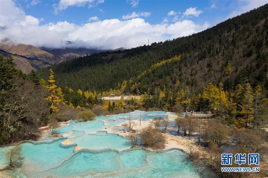 藍(lán)天白云與彩林、彩池構(gòu)成一幅美麗畫卷(10月19日無人機(jī)拍攝)。深秋時(shí)節(jié),在雪山、藍(lán)天、白云和彩林映襯下,黃龍溝中的彩池色彩更加斑斕,目前黃龍景區(qū)進(jìn)入觀賞最佳時(shí)節(jié)。黃龍風(fēng)景名勝區(qū)位于四川省松潘縣境內(nèi),以彩池、灘流、雪山、峽谷、森林等聞名,享有“人間瑤池”“圣地仙境”之美譽(yù)。新華社記者 江宏景攝