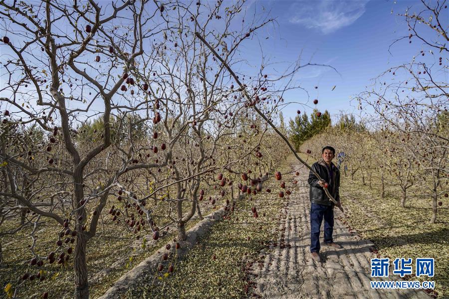 10月20日,在且末縣阿熱勒鎮(zhèn)有機紅棗園里,棗農(nóng)在撿拾成熟的紅棗。 新華社記者 趙戈 攝