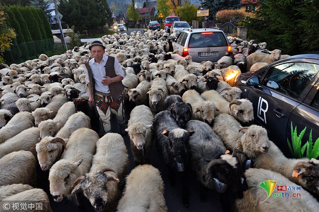 牧羊人趕著羊群走下波蘭南部喀爾巴阡山,他們要走20英里才能回到農(nóng)場(chǎng)。