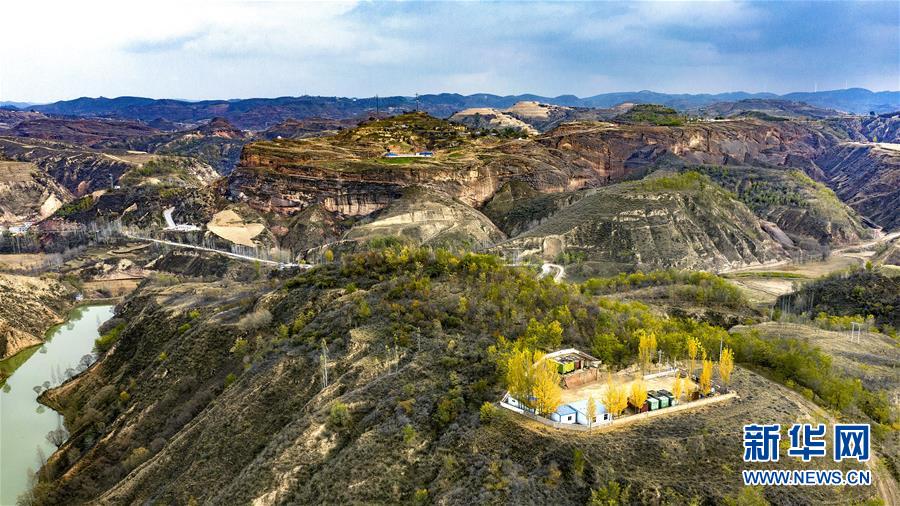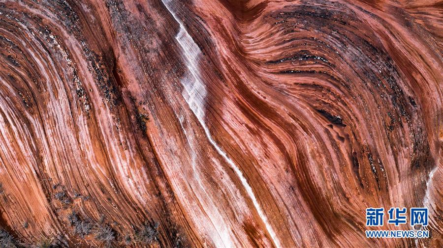 在黃土高原的陜西省延安市安塞區(qū)坪橋鎮(zhèn)王家灣,有一處峽谷丹霞地貌,是2017年陜西省地質調查院在陜北及渭北地區(qū)發(fā)現大規(guī)模丹霞地貌的一部分。這里的山勢頂部被黃土覆蓋,底部經流水下切侵蝕紅色砂巖外露,出露的巖石紋理如波浪,深秋中猶如一幅流動的畫卷。