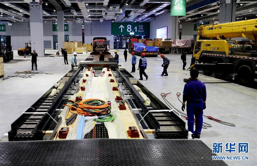 10月22日,“金牛座”龍門銑床床身(前)等待裝運(yùn)。 當(dāng)日,來自德國的首屆進(jìn)口博覽會(huì)最大展品——“金牛座”龍門銑床完成初步組裝,將運(yùn)往國家會(huì)展中心(上海)3號(hào)館進(jìn)行最后的安裝施工。這是德國瓦德里??票す狙邪l(fā)的機(jī)床設(shè)備,高約8米,占地面積約200平方米,將在智能及高端裝備區(qū)進(jìn)行展出。 新華社記者方喆攝