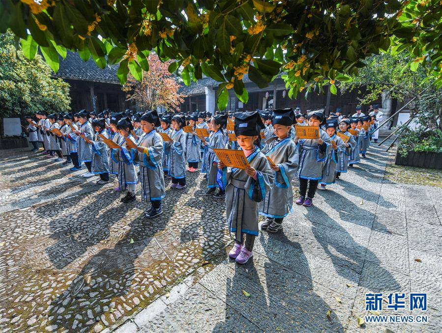 10月23日,學生們在老師的帶領下誦讀國學經典。當日,浙江省長興縣第八小學舉行“誦家規(guī)家訓,傳中華美德”校園“誠敬日”主題教育活動,通過誦讀國學經典、講勵志故事、演美德戲劇等形式,讓學生感受優(yōu)秀傳統(tǒng)文化。近年來,該學校立足“誠敬”文化,注重國學啟蒙教育,讓學生從小培養(yǎng)“以誠立身、以敬處事”的良好品質。新華社記者 徐昱 攝