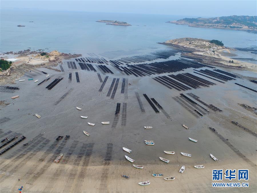 10月24日,福建莆田蔣山村村民在海上收割紫菜(無(wú)人機(jī)拍攝)?! ⌒氯A社記者姜克紅 攝