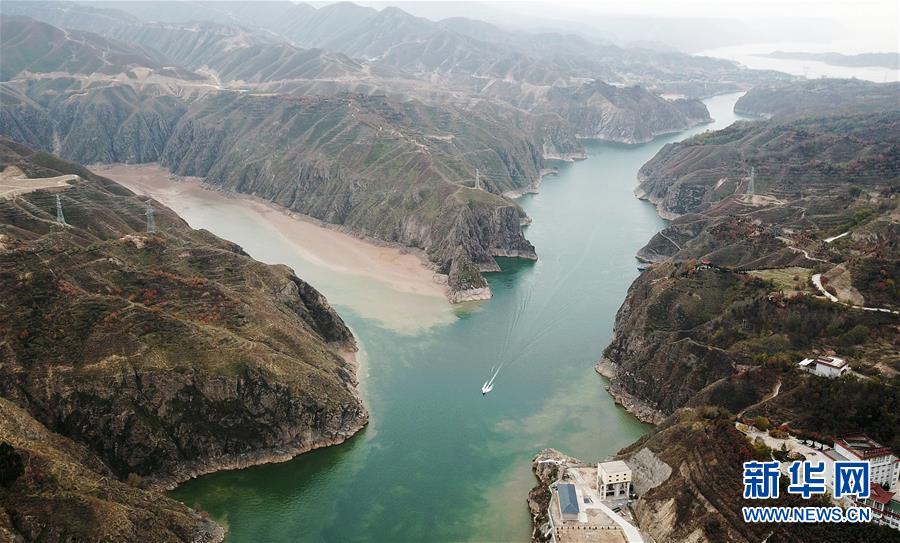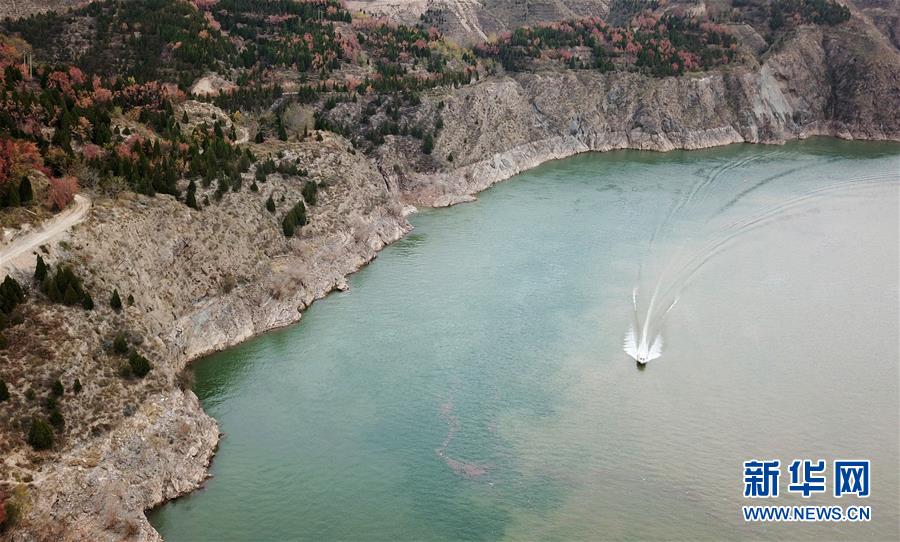 10月24日,一艘快艇從劉家峽水庫庫區(qū)駛過(無人機拍攝)。  新華社記者 陳斌 攝