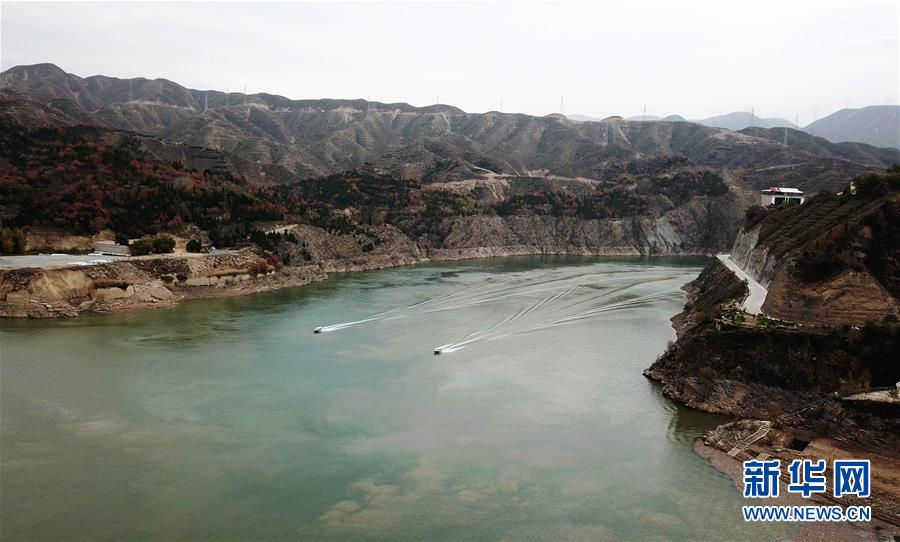 10月24日,兩艘快艇從劉家峽水庫庫區(qū)駛過(無人機拍攝)。  新華社記者 陳斌 攝