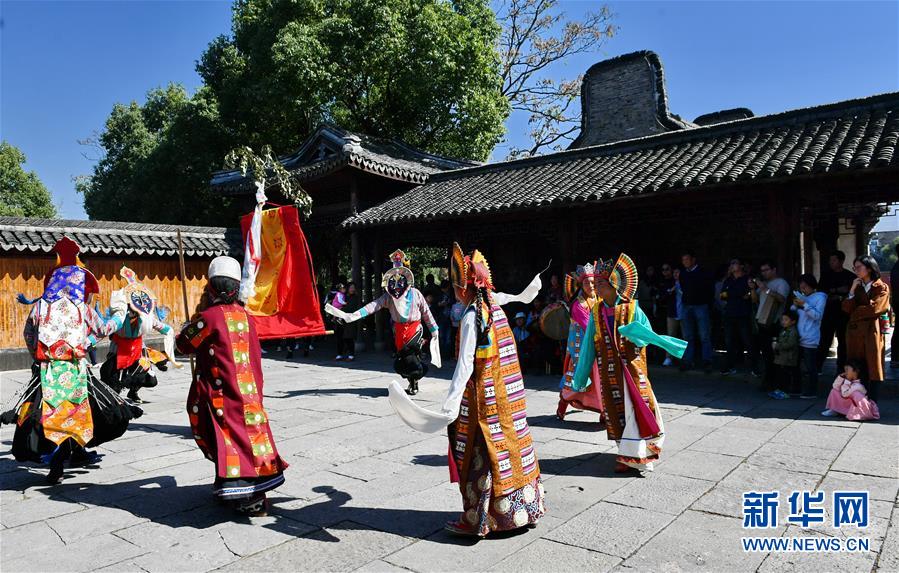 在浙江烏鎮(zhèn)西柵景區(qū)的安渡坊碼頭廣場上,西藏迥巴藏戲隊(duì)表演藏戲《頓月頓珠》(10月28日攝)。 新華社記者 張汝鋒 攝