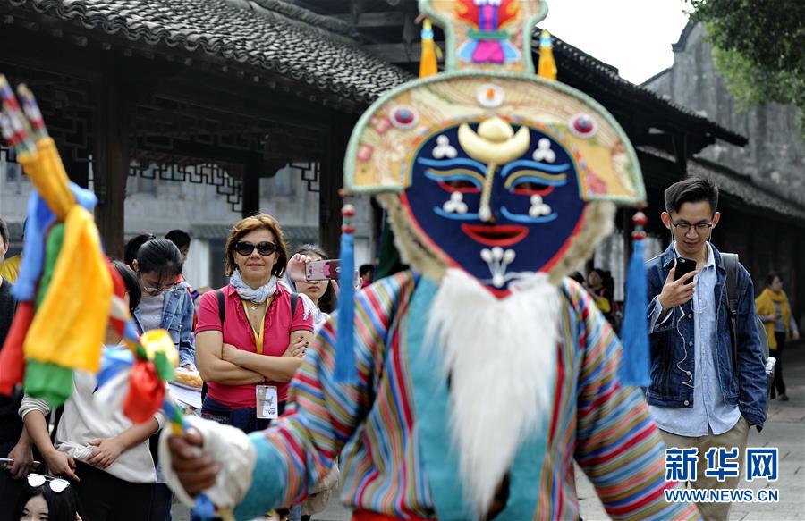 在浙江烏鎮(zhèn)西柵景區(qū)的安渡坊碼頭廣場上,觀眾觀看西藏迥巴藏戲隊(duì)出場(10月26日攝)。