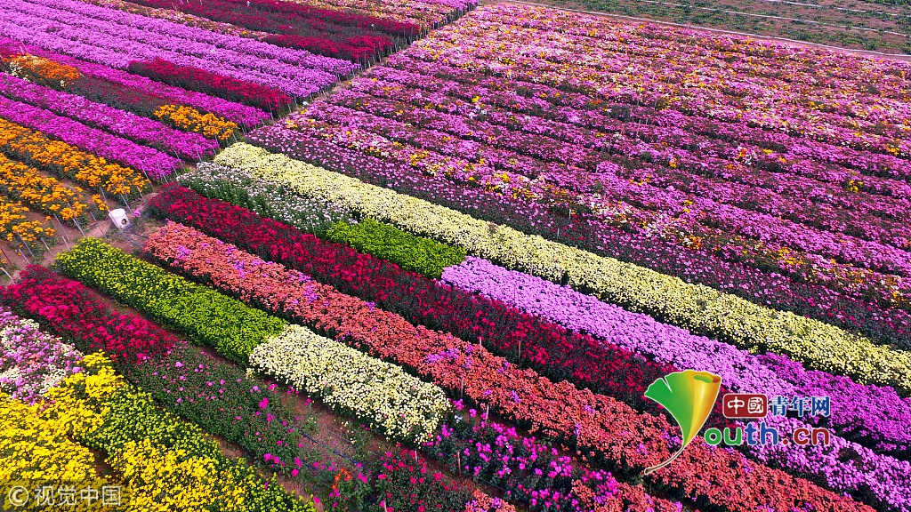 河南許昌觀賞彩菊綻放如五彩地毯 航拍展現震撼美