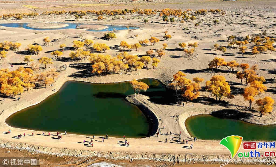 中國(guó)青年網(wǎng)北京10月9日電 2018年10月7日至8日,內(nèi)蒙古自治區(qū)阿拉善盟額濟(jì)納旗,地處巴丹吉林沙漠。額濟(jì)納河兩岸壯觀的胡楊林堪稱大漠的一顆綠色明珠,每年深秋時(shí)節(jié)的第一場(chǎng)秋霜過(guò)后,大片的胡楊樹葉由綠變黃,一眼望去,陽(yáng)光下金色的樹葉襯著湛藍(lán)的天空于風(fēng)中婆娑起舞,鮮明的影調(diào),亮麗的色彩,令人流連忘返。