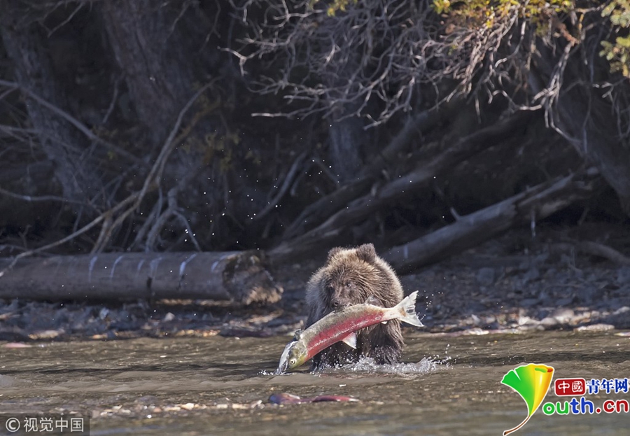 2018年10月29日訊(具體拍攝時(shí)間不詳),加拿大英屬哥倫比亞,一只15個(gè)月大的棕熊幼崽在Chilko Lake湖畔成功捉到一只4公斤重的紅色鮭魚(yú)。