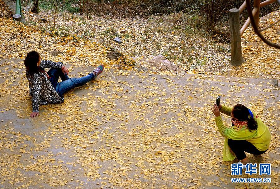 11月1日,游客在河南省嵩縣白河鄉(xiāng)下寺村古銀杏樹(shù)下拍照。 深秋時(shí)節(jié),河南省嵩縣白河鄉(xiāng)下寺村的古銀杏林為小山村披上了“金甲”。漫天黃葉,遍地金色,一幢幢民居掩映在色彩斑斕的世界里,美不勝收,吸引了眾多游客賞景拍照。 新華社記者 李安 攝