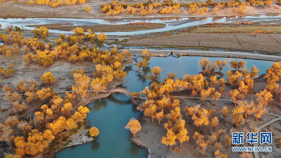 這是在內(nèi)蒙古自治區(qū)額濟(jì)納旗拍攝的胡楊林(10月10日無人機(jī)拍攝)。 金秋時節(jié),內(nèi)蒙古自治區(qū)額濟(jì)納旗胡楊林如同披上金裝,成為大漠中的一抹亮色,吸引眾多中外游客前來觀賞游玩。 新華社記者鄒予攝
