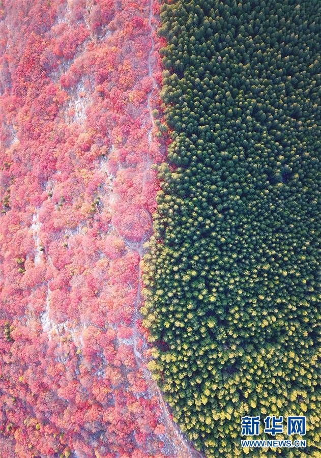 這是山東濟(jì)南楔子山色彩分明的樹(shù)林(10月31日無(wú)人機(jī)拍攝)。 新華社記者朱崢攝