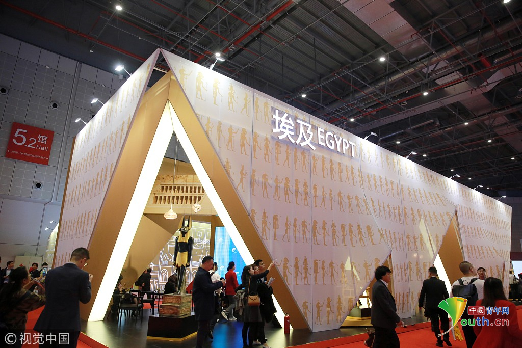 2018年11月6日,上海,首屆中國國際進口博覽會國家展上,共有82個國家、3個國際組織設立了71個展臺。埃及館。視覺中國
