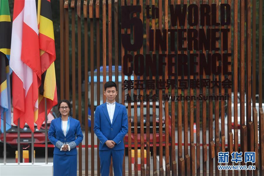 11月6日,來(lái)自浙江外國(guó)語(yǔ)學(xué)院的大學(xué)生志愿者在烏鎮(zhèn)迎接參會(huì)嘉賓。 新華社記者黃宗治攝