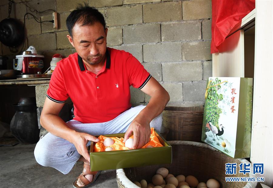 5月16日,在重慶市銅梁區(qū)永嘉鎮(zhèn)高龍村,閻仁兵在包裝孔雀蛋。 新華社記者 王全超 攝
