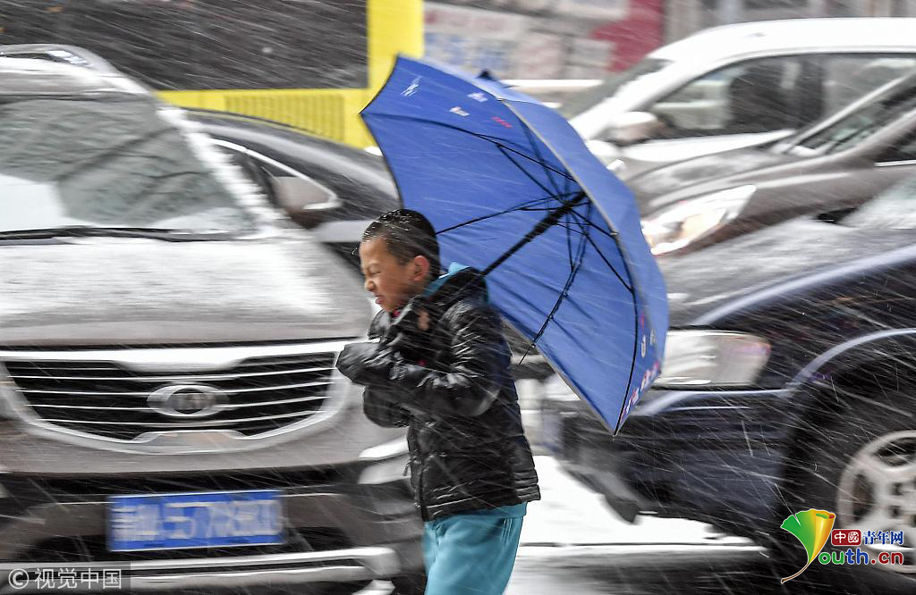 2018年11月12日,持續(xù)濃霧天氣的新疆烏魯木齊市,又迎來一場(chǎng)雨雪天氣,氣溫隨之驟降。圖為一名男孩打著雨傘與風(fēng)雪“抗?fàn)帯?。圖片作者:劉新