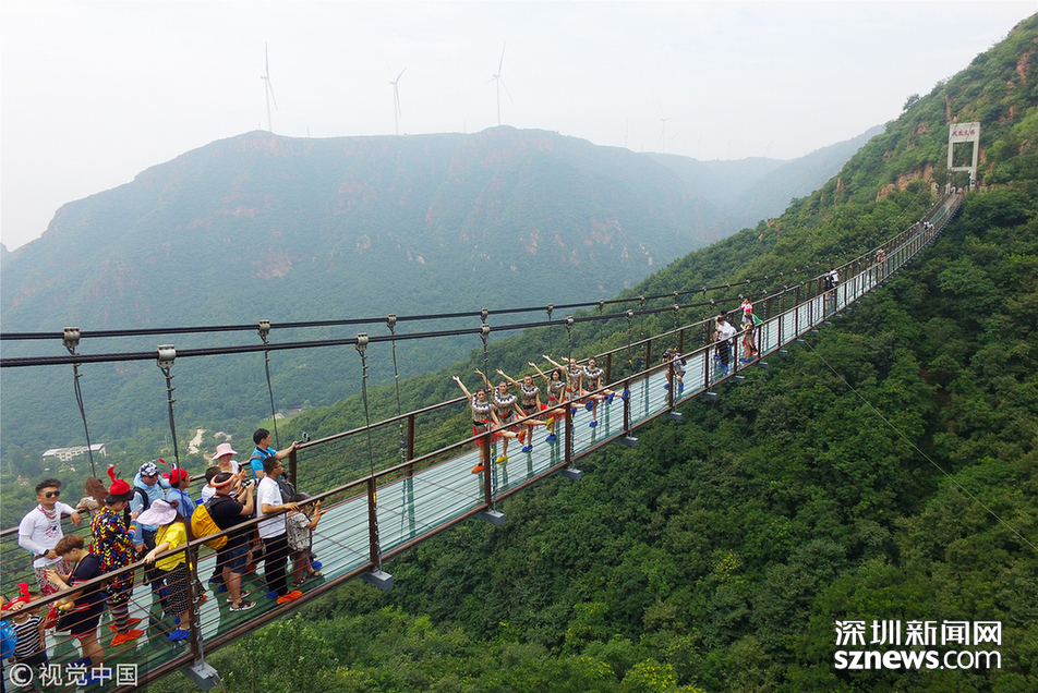 2018年6月30日,鄭州新密一景區(qū)的玻璃吊橋上,幾名美女大學(xué)生身穿“野人”服裝練習(xí)瑜伽,吸引了眾多游客的圍觀。據(jù)了解,這些大學(xué)生來自鄭州。