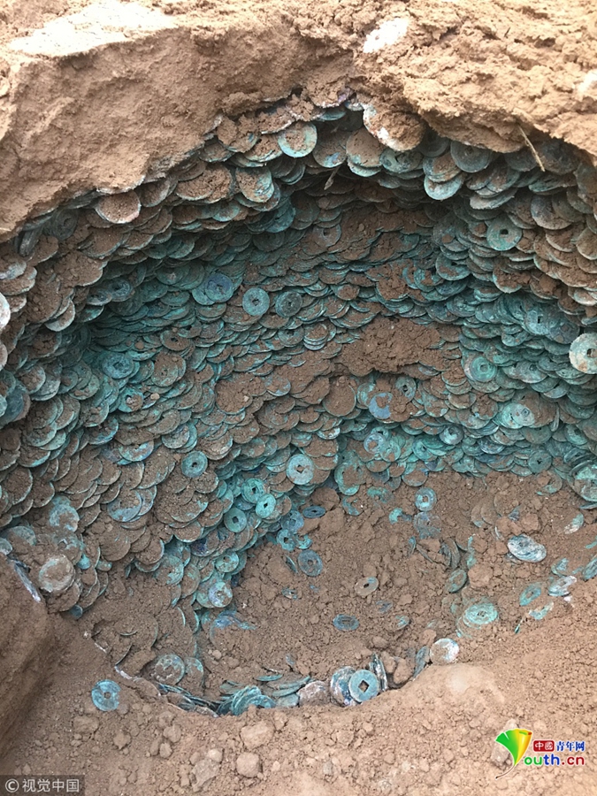 11月9 日中午11 時許,該縣縣城一工地在對地面開挖施工時,發(fā)現(xiàn)地下埋藏有大量古幣,立即報(bào)警。警方快速趕到現(xiàn)場進(jìn)行保護(hù)。得知這一信息后,市、縣兩級文物部門工作人員立即趕到,并由專業(yè)考古人員進(jìn)行發(fā)掘。發(fā)掘現(xiàn)場拍攝的照片顯示,這些古幣埋在一個圓形的土坑中。