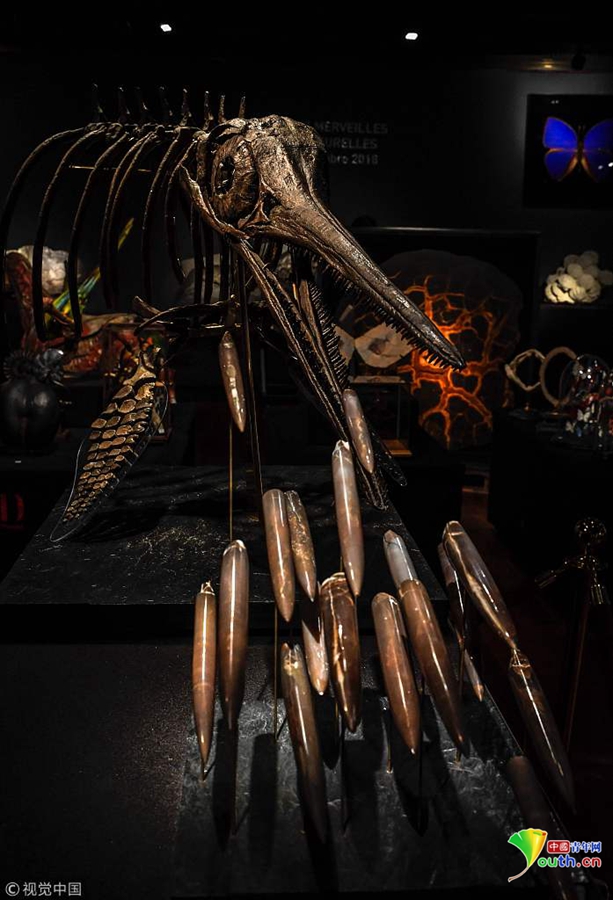 當地時間2018年11月19日,法國巴黎,在展出中的1.8億年前侏羅紀時期的恐龍骨架,將于11月20日在Drouot拍賣行拍賣。
