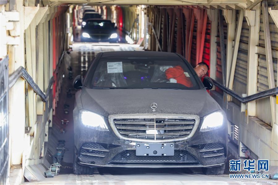 11月19日,在首趟中歐班列商品車專用車運輸國際班列的車廂內(nèi),工作人員駕駛著進(jìn)口整車進(jìn)行卸貨作業(yè)。 新華社記者 劉潺 攝