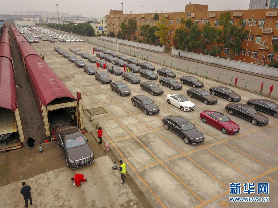 11月19日,在重慶團(tuán)結(jié)村站貨場(chǎng)內(nèi),首趟中歐班列商品車專用車運(yùn)輸國際班列在進(jìn)行卸貨作業(yè)(無人機(jī)拍攝)。 新華社記者 劉潺 攝