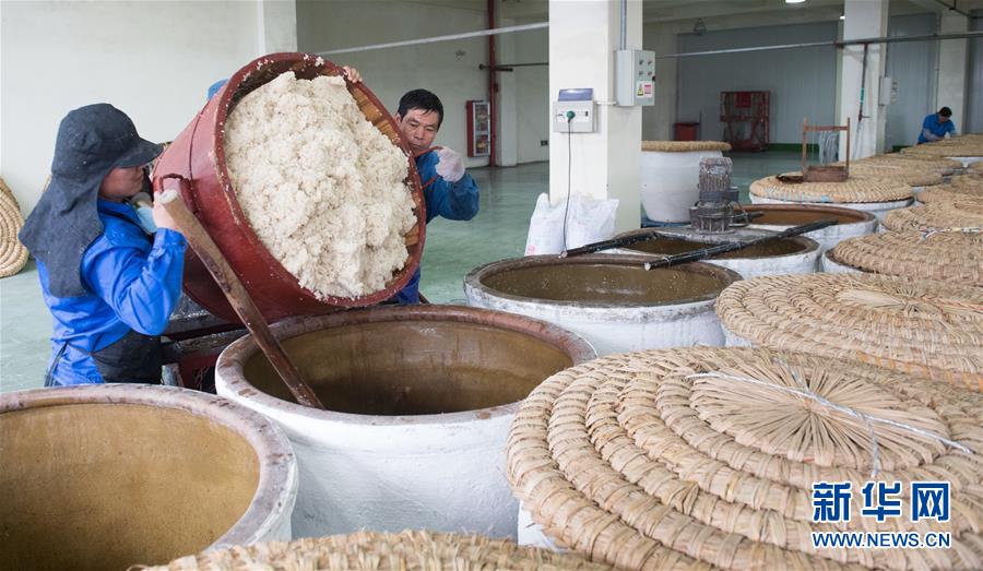 11月21日,工作人員在紹興女兒紅釀酒有限公司釀酒廠房將剛煮熟的糯米落缸。 浙江紹興一帶有“生女釀好酒、婚嫁宴賓客”的習(xí)俗,所釀之酒稱“女兒紅”。在紹興市上虞區(qū)東關(guān)街道,一家釀酒廠仍保留著傳統(tǒng)的黃酒生產(chǎn)線,恪守著近20道釀造工序,延續(xù)著傳統(tǒng)黃酒的釀制技藝和生女必釀“女兒紅”的文化習(xí)俗。 黃酒是中國最古老的酒種之一,傳統(tǒng)黃酒僅在冬季取鑒湖水和糯米釀制,所得之酒澄澈馥郁。 新華社記者翁忻旸攝