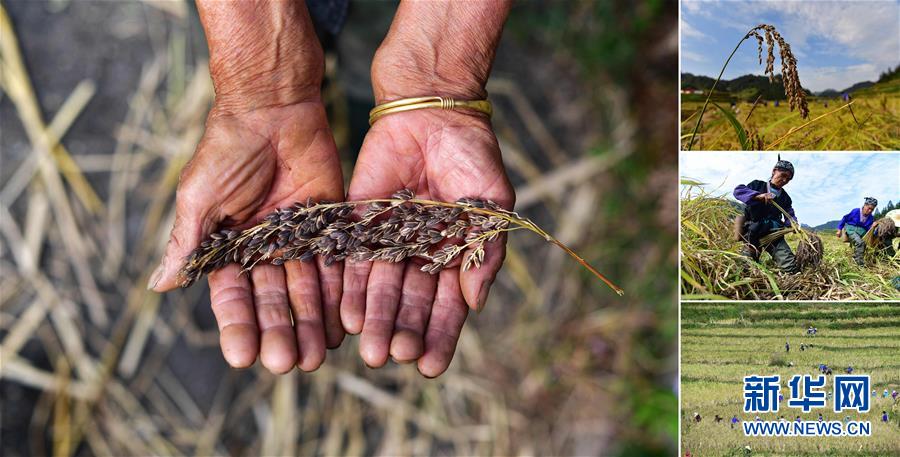 拼版照片:左圖為在安太鄉(xiāng)元寶村,80歲的賈榮專手捧剛剛收獲的香糯;右上圖為成熟待收的香糯;右中圖為賈榮專(左)在收割香糯;右下圖為村民們?cè)谑障闩矗ㄕ掌鶖z于10月30日)。2017年,賈榮專加入村里的香糯種植合作社。香糯是廣西融水大苗山的特產(chǎn),它生長(zhǎng)在高寒高海拔的特殊自然環(huán)境中,產(chǎn)量少,營(yíng)養(yǎng)價(jià)值高。 廣西融水苗族自治縣是國(guó)家扶貧工作重點(diǎn)縣,全縣“九山半水半分田”,生活生產(chǎn)環(huán)境較為惡劣,脫貧攻堅(jiān)任務(wù)艱巨,目前還有7.68萬(wàn)貧困人口。面對(duì)經(jīng)濟(jì)發(fā)展落后、貧困面廣且程度深的現(xiàn)狀,當(dāng)?shù)匕衙撠毠?jiān)與創(chuàng)新產(chǎn)業(yè)扶持相結(jié)合,依托生態(tài)資源優(yōu)勢(shì),實(shí)施“特色產(chǎn)業(yè)富民行動(dòng)”,通過(guò)發(fā)展特色民族旅游、林下經(jīng)濟(jì)和特色養(yǎng)殖業(yè)等扶貧產(chǎn)業(yè),帶動(dòng)貧困群眾依靠勤勞的雙手,拔窮根摘窮帽,實(shí)現(xiàn)脫貧致富。據(jù)了解,目前全縣貧困戶參與特色產(chǎn)業(yè)發(fā)展的有2.9萬(wàn)戶,扶貧產(chǎn)業(yè)覆蓋率達(dá)95%。 新華社記者 黃孝邦 攝