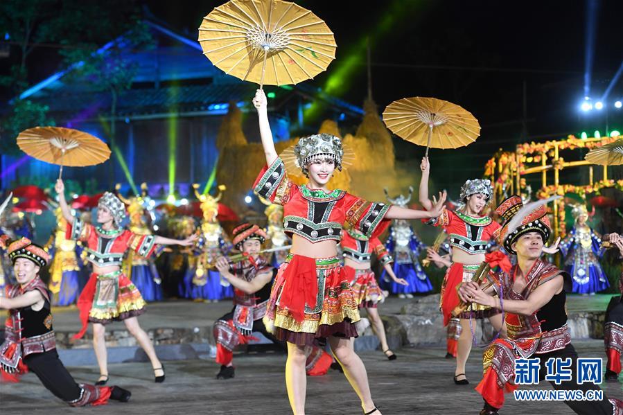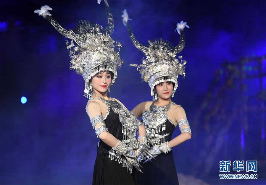 11月21日,演員表演歌舞《依依送客》。 當(dāng)日,廣西柳州市第一屆旅游產(chǎn)業(yè)發(fā)展大會(huì)暨2018第十八屆中國(guó)·融水苗族蘆笙斗馬節(jié)開幕式晚會(huì)在融水苗族自治縣舉行。 新華社記者 周華 攝