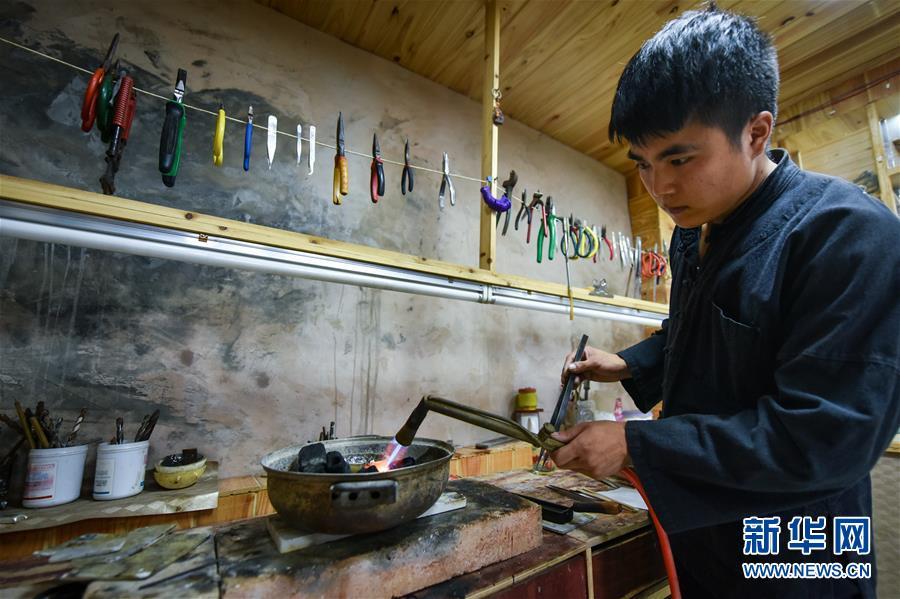 龍懂陽的弟弟龍?zhí)栆彩倾y飾工藝傳人。和哥哥不同,弟弟主打的是銀飾文化體驗游,用自家傳統(tǒng)苗寨開設(shè)民宿,游客在此居住的同時,還能學習體驗銀飾品制作。每年暑期一到,家長孩子絡(luò)繹不絕。新客源、新銷路、新模式帶動雷山縣銀飾業(yè)不斷發(fā)展壯大,成為脫貧攻堅的重要產(chǎn)業(yè)。2017年,雷山縣控拜、麻料、烏高三個村銀飾品及相關(guān)產(chǎn)業(yè)銷售額超過1.5億元,吸引很多外出打工的年輕人回家創(chuàng)業(yè)。苗寨鍛銀聲在綠水青山間響遍千戶,也漸漸走出大山,聲名遠播。新華社記者 李芒茫 攝