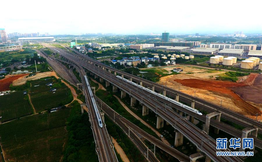 一列動(dòng)車在南寧市區(qū)行駛(9月4日無人機(jī)拍攝)。 廣西壯族自治區(qū)成立60年來,鐵路建設(shè)發(fā)生翻天覆地的變化。來自中國鐵路南寧局集團(tuán)有限公司的數(shù)據(jù)顯示,1958年廣西鐵路總里程為1346.3公里,如今廣西鐵路總里程達(dá)5191公里。廣西與周邊相鄰省份間實(shí)現(xiàn)動(dòng)車“公交化”開行。此外,北部灣港—重慶班列、東盟海產(chǎn)品冷鏈班列、“百色一號(hào)”果蔬專列等的開通和運(yùn)營,強(qiáng)化了鐵路供給的針對(duì)性和有效性。鐵路成為助推廣西經(jīng)濟(jì)社會(huì)快速發(fā)展的“大動(dòng)脈”。 新華社記者陸波岸攝
