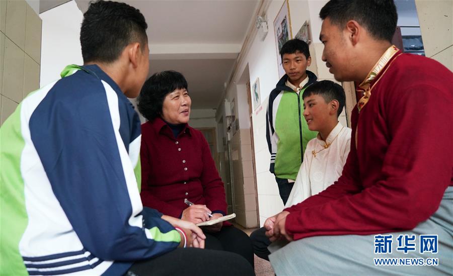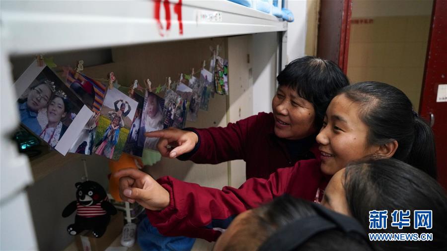 11月16日,在南昌市第十七中學(xué)宿舍,劉和平(右二)為一名西藏班學(xué)生梳頭。新華社記者 胡晨歡 攝