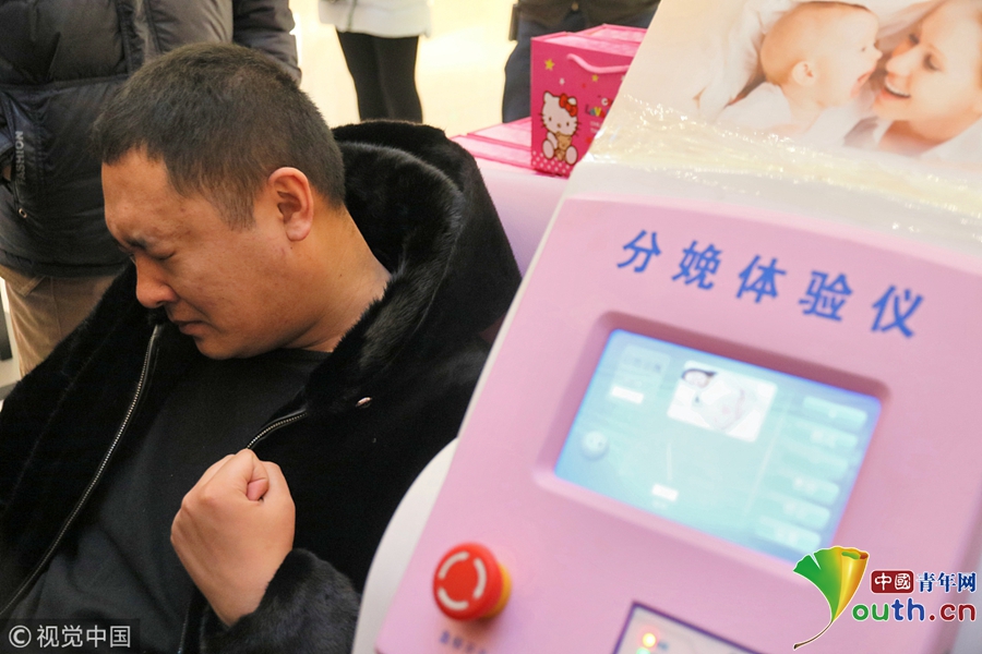 2018年3月8日,一名男士在山東煙臺大悅城通過“分娩體驗儀”感受“分娩”時的陣痛。