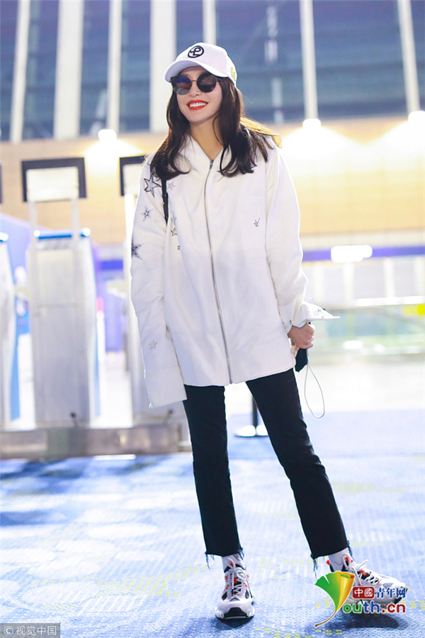 11月29日,上海,秦嵐現(xiàn)身機場。她戴白色鴨舌帽,穿白色星星圖案外套配微喇牛仔褲,架黑超涂紅唇笑靨如花。