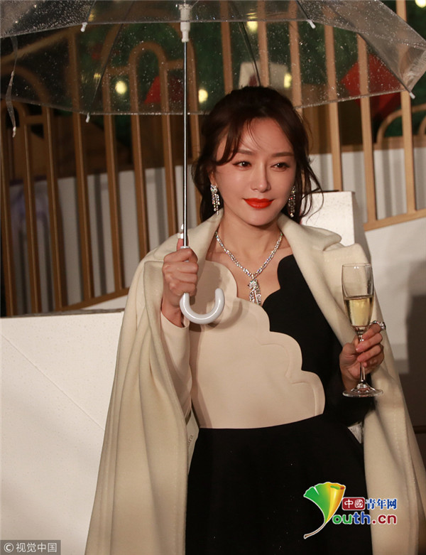 秦嵐撐傘雪膚紅唇美如畫(huà) 優(yōu)雅品香檳氣質(zhì)高貴迷人