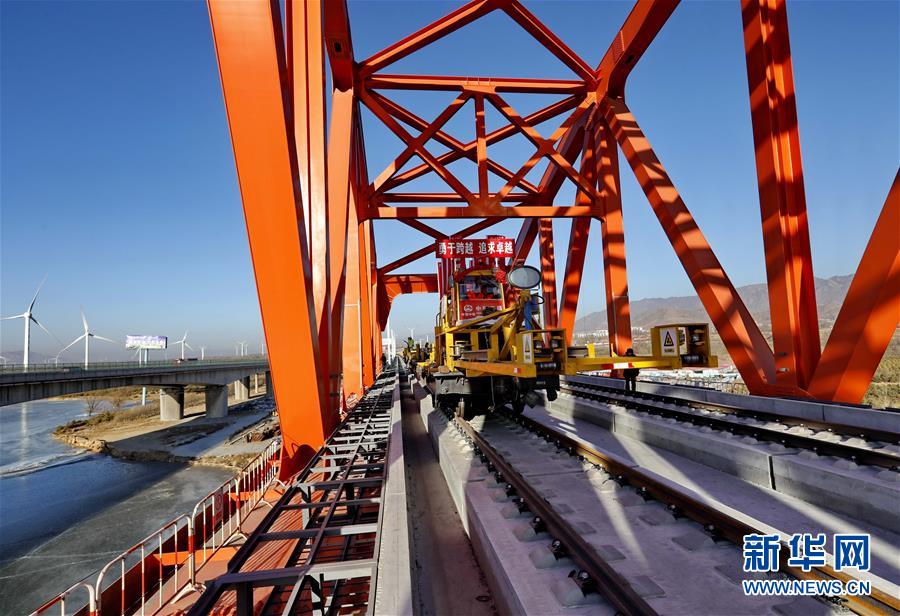 1月13日,中鐵三局的工人在京張高鐵官?gòu)d水庫(kù)特大橋進(jìn)行鋪軌作業(yè)。 新華社記者 楊世堯 攝