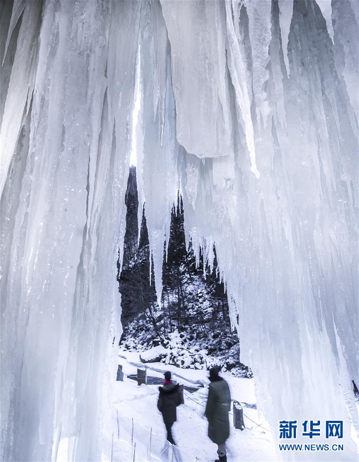 游人在吉林省長白縣十五道溝望天鵝景區(qū)內觀賞冰瀑景觀(1月3日攝)。新華社記者張楠攝