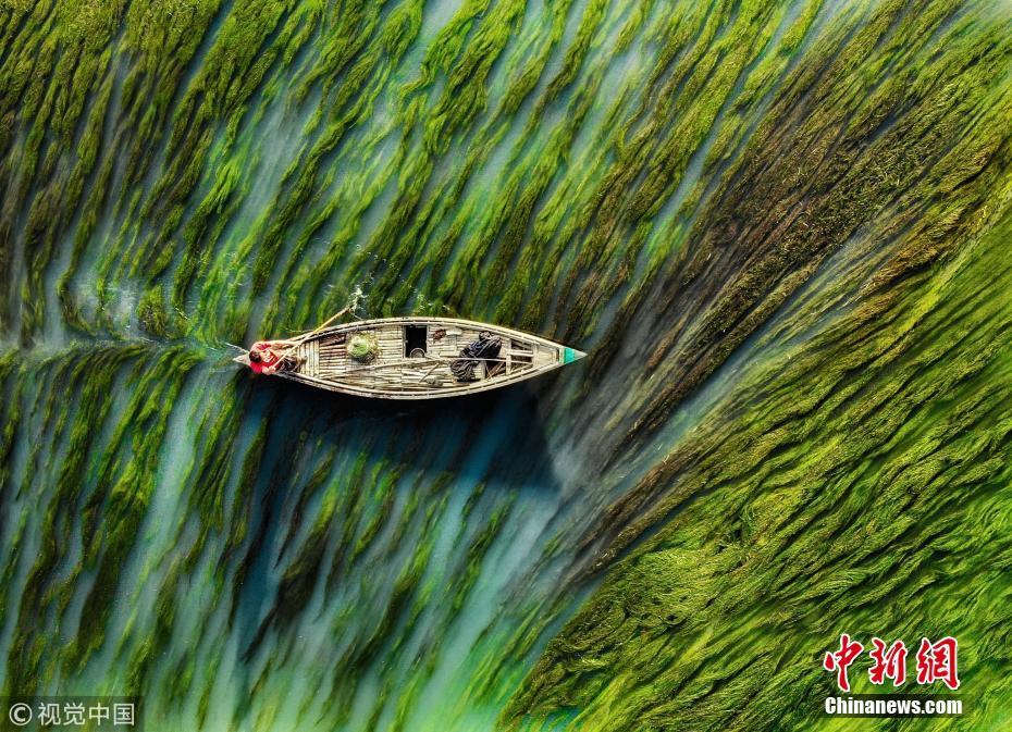 中國新聞網(wǎng)1月14日訊(具體拍攝時(shí)間不詳),孟加拉國烏拉帕拉,漁船在水流和藻類的映襯下前行,畫面看起來就像水彩畫一般。圖片來源:視覺中國