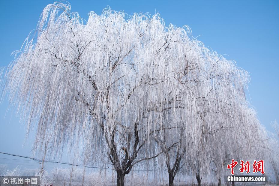 1月13日,107國(guó)道河北省定州路段出現(xiàn)霧凇(樹掛)景觀,吸引路人駐足拍照留念。王保生 攝 圖片來源:視覺中國(guó)