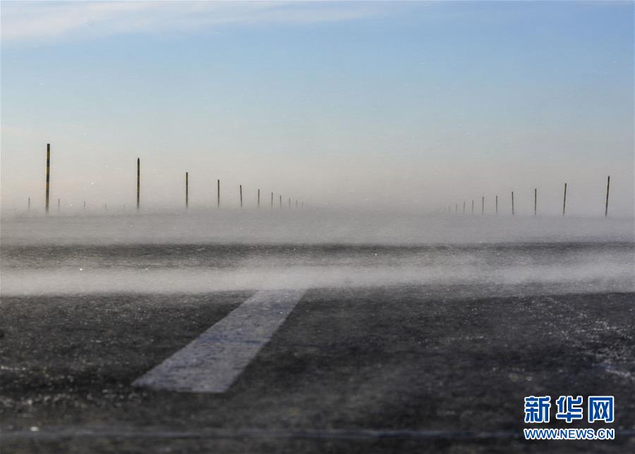 在新疆瑪依塔斯風(fēng)區(qū)內(nèi),公路上大風(fēng)卷起細(xì)雪飄散開來(1月13日攝)。 瑪依塔斯風(fēng)區(qū)位于新疆西北部額敏縣境內(nèi)。這里東西風(fēng)交替頻繁,一年大風(fēng)天數(shù)超過150天,是世界上罕見的暴風(fēng)雪災(zāi)害地段。駐守在這里的新疆塔城公路管理局額敏分局瑪依塔斯應(yīng)急保障基地,近年來連續(xù)裝備拋雪機(jī)等冰雪搶險救災(zāi)裝備,有力地保障了這條道路的交通安全。 新華社記者趙戈攝