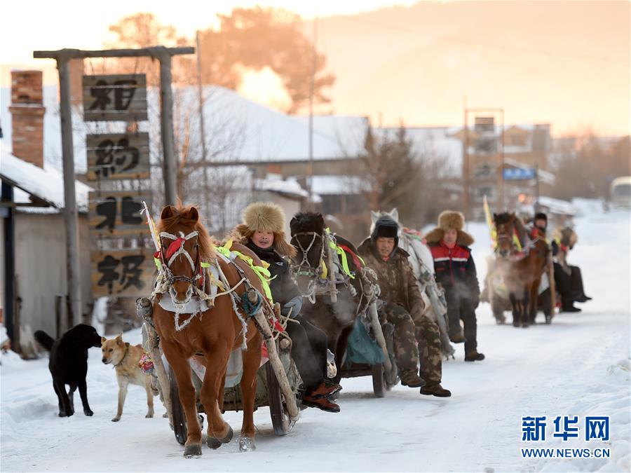 1月25日,在黑龍江省漠河市北極村,馬爬犁載著游客去神州北極廣場(chǎng)“找北”。
