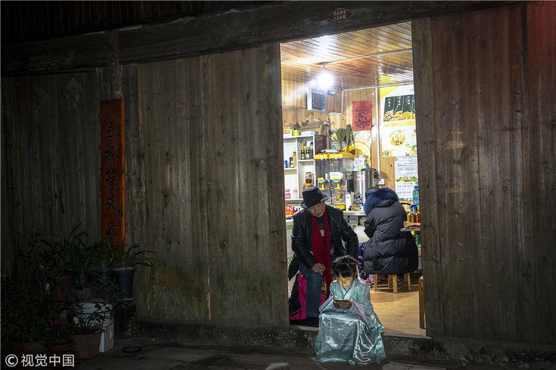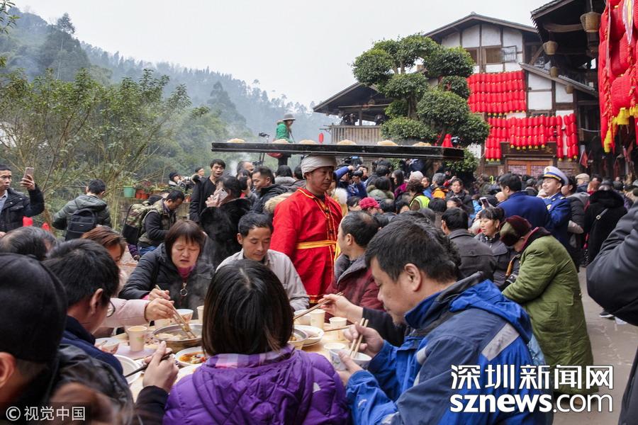 2019年1月26日,重慶中山古鎮(zhèn),880桌“千米長宴”5萬人共品年味。當?shù)刳s來的村民。