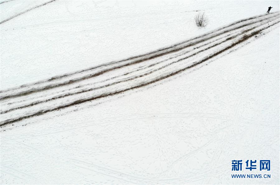1月24日,在黑龍江省漠河市北極村,馬爬犁在雪地上留下一道道痕跡(無(wú)人機(jī)拍攝)。新華社記者 才揚(yáng) 攝