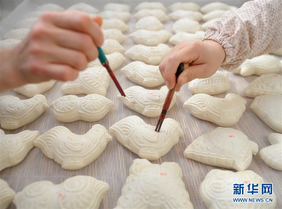 1月31日,河北省黃驊市一家面花作坊的工人給剛剛出籠的面花點(diǎn)上寓意吉祥喜慶的紅點(diǎn)。 河北黃驊市有著過(guò)年蒸面花的習(xí)俗。春節(jié)前夕,當(dāng)?shù)孛婊ㄖ谱鞴S加班加點(diǎn)制作面花,供應(yīng)春節(jié)市場(chǎng)。 新華社記者牟宇攝
