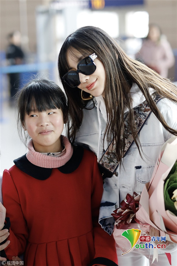 2019年2月24日,上海,楊穎現(xiàn)身機(jī)場。她全白套裝現(xiàn)身身材十分纖細(xì),手捧粉絲送的花與小粉絲合影,十分親切。