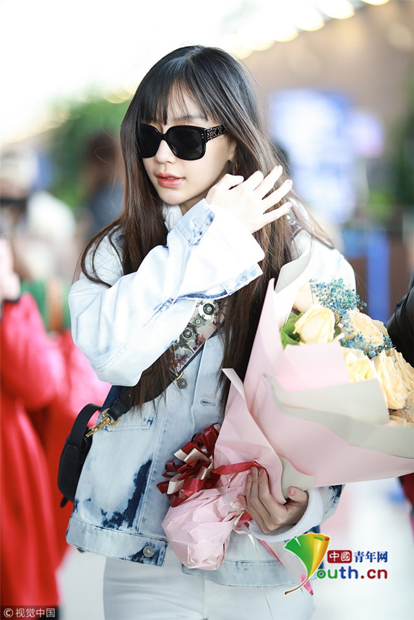 2019年2月24日,上海,楊穎現(xiàn)身機(jī)場(chǎng)。她全白套裝現(xiàn)身身材十分纖細(xì),手捧粉絲送的花與小粉絲合影,十分親切。