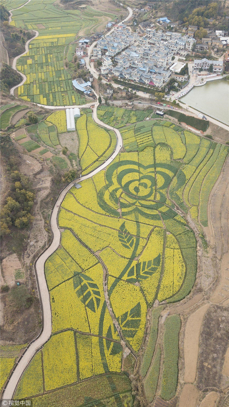 2019年近日,在云南省安寧市山口村,油菜花田里“長出”一朵巨大的“山茶花”,吸引游客到此觀賞拍照。圖為3月1日,航拍油菜花田中的山茶花圖案。劉冉陽(云南分社)/中新社/視覺中國