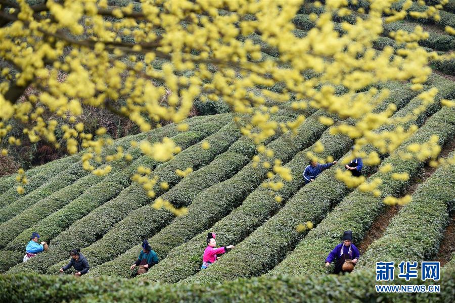 3月17日,采茶工在丹寨縣龍泉鎮(zhèn)馬寨村的茶園里采摘春茶。